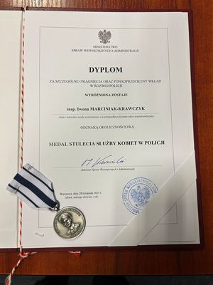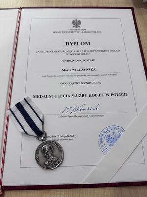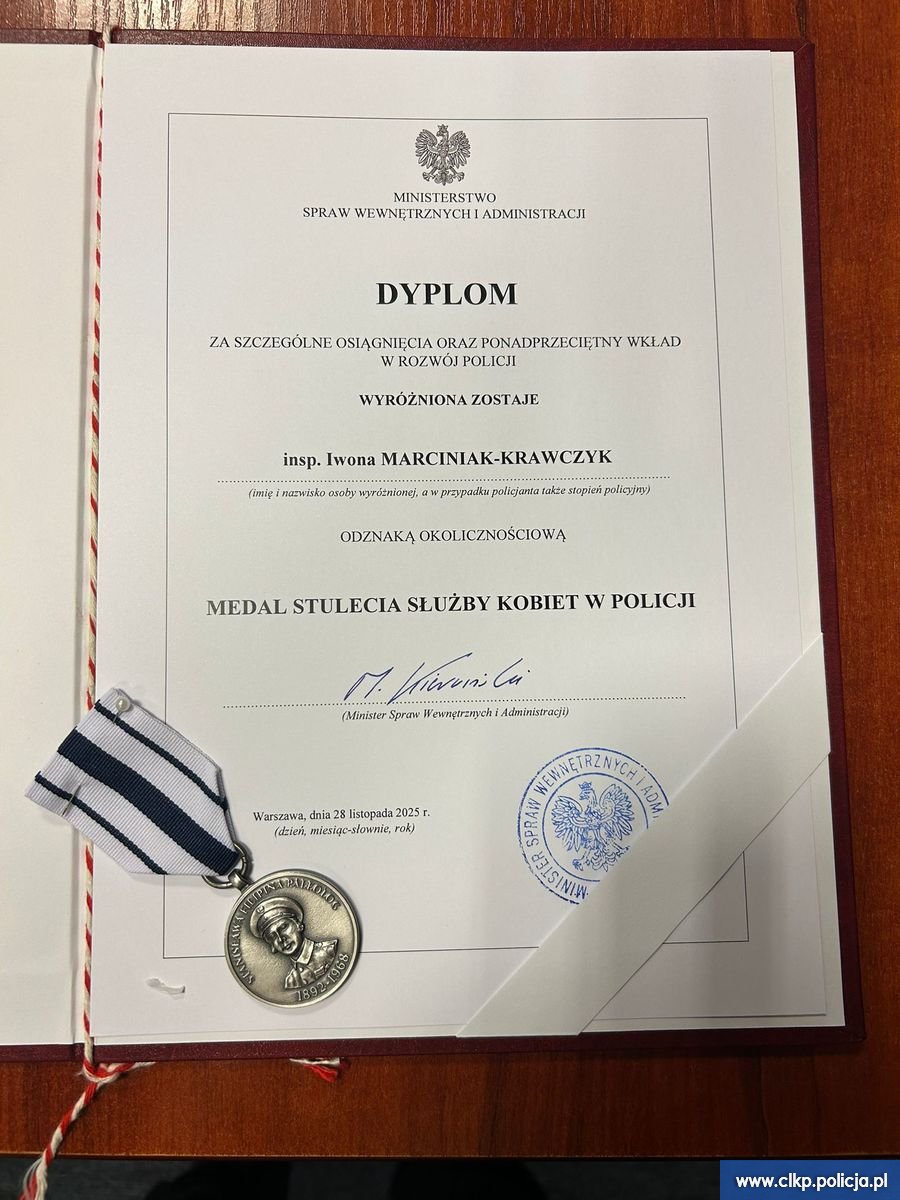 Z okazji 100-lecia służby kobiet w Policji, minister spraw wewnętrznych i administracji swoim zarządzeniem ustanowił odznakę okolicznościową, która jest wyrazem docenienia i uznania niezwykłego wkładu oraz poświęcenia kobiet w funkcjonowanie i rozwój Policji, a także propagowanie roli kobiet w historię Policji. Odznaki okolicznościowe „Medal 100-lecia służby kobiet w Policji” nadano 76 osobom. Wyróżnionym wręczyli je minister Marcin Kierwiński, sekretarz stanu w MSWiA Czesław Mroczek oraz szef polskiej Policji gen. insp. Marek Boroń.
