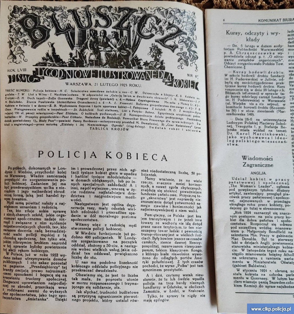 26 lutego 1925 roku Minister Spraw Wewnętrznych Cyryl Ratajski polecił utworzenie Policji Kobiecej. Pierwsze funkcjonariuszki szkolono w Komendzie Głównej Policji Państwowej w Warszawie, przygotowując je m.in. do walki z handlem ludźmi i przestępstwami przeciwko obyczajności.